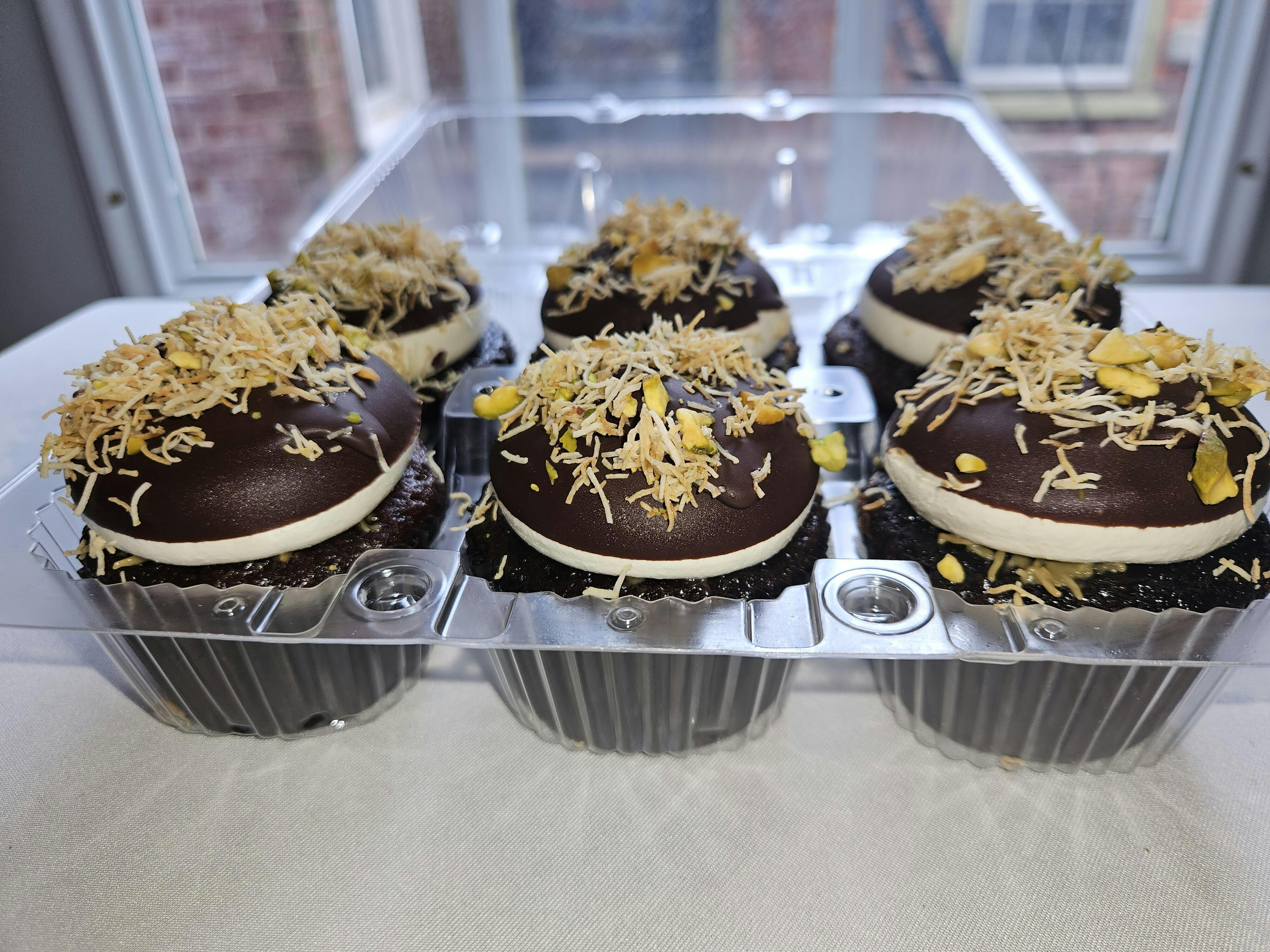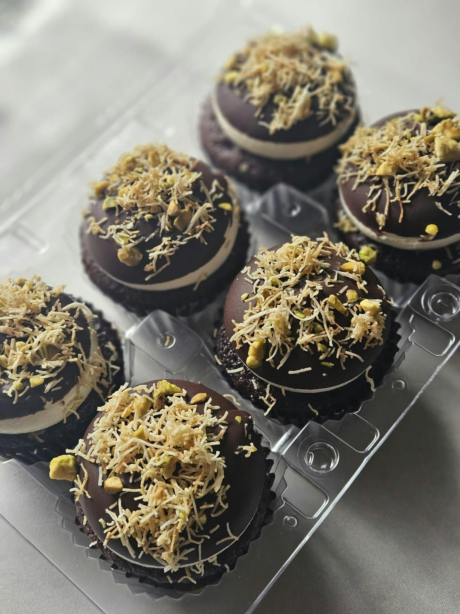 Savor the sweet luxury with this exclusive 6-count box of hand-decorated Dubai Chocolate Cupcakes. Each bite delivers rich, velvety chocolate and a luscious pistachio cream infused with kataifi (shredded phyllo), creating a one-of-a-kind texture and flavor.